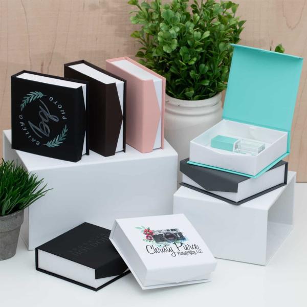 As with everything in our Classic Collection of products, this flash drive box is wrapped in a smooth, matte paper that is satisfying to the touch. When finished with your studio’s logo or client’s name printed on the top of the box, the recipient will know that they hired a professional to capture their special occasion. The inside of the box walls features a textured finish on all sides, while a trustworthy elastic band ensures the flash drive will stay put on its bed of plush fabric. A discreet magnet, built into the closure tab on the lid, connects to the box itself making sure the contents are secure.